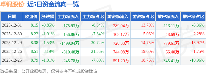证券之星消息,截至2025年12月31日收盘,卓锦股份(688701)报收于8.15元,下跌0.85%,换手率1.94%,成交量2.61万手,成交额2109.67万元。