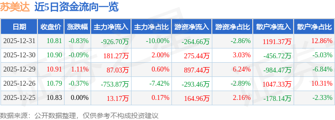 12月31日的资金流向数据方面,主力资金净流出926.7万元,占总成交额10.0%,游资资金净流出264.66万元,占总成交额2.86%,散户资金净流入1191.37万元,占总成交额12.86%。