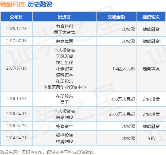 证券之星消息,根据天眼查APP于12月28日公布的信息整理,武汉珞珈德毅科技股份有限公司战略融资,融资额未披露,参与投资的机构包括力合科创,西工大资管。