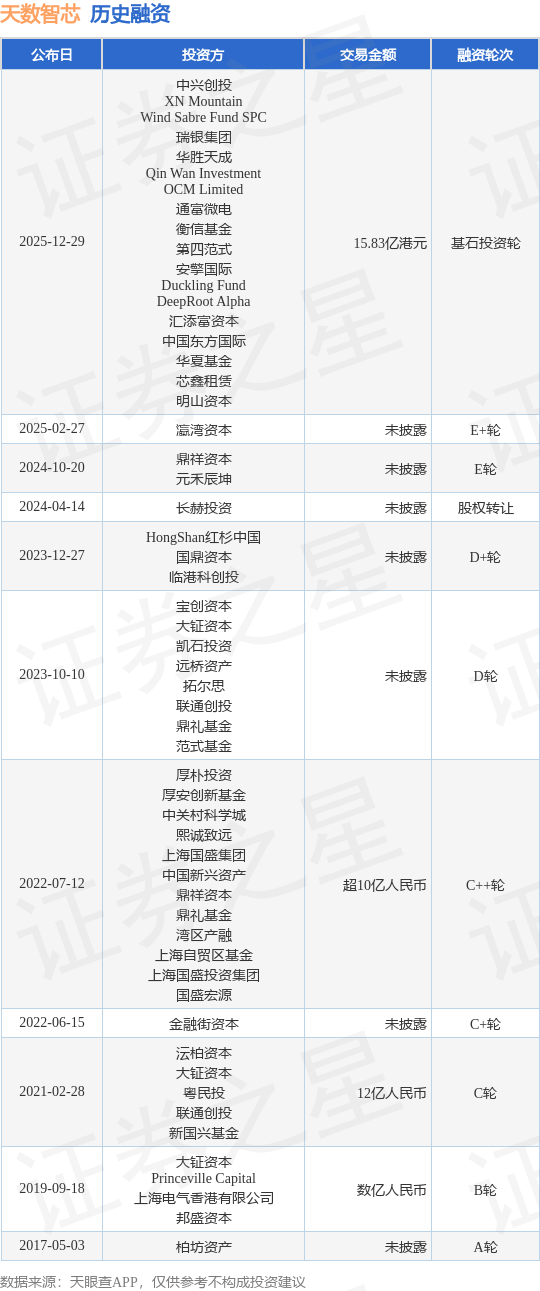 证券之星消息,根据天眼查APP于12月29日公布的信息整理,上海天数智芯半导体股份有限公司基石投资轮融资,融资额15.83亿港元,参与投资的机构包括中兴创投,XN Mountain,Wind Sabre Fund SPC,瑞银集团,华胜天成,Qin Wan Investment,OCM Limited,通富微电,衡信基金,第四范式,安擎国际,Duckling Fund,DeepRoot Alpha,汇添富资本,中国东方国际,华夏基金,芯鑫租赁,明山资本。