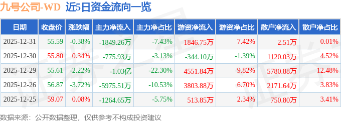 证券之星消息,截至2025年12月31日收盘,九号公司(689009)报收于55.59元,下跌0.38%,换手率0.8%,成交量4.45万手,成交额2.49亿元。