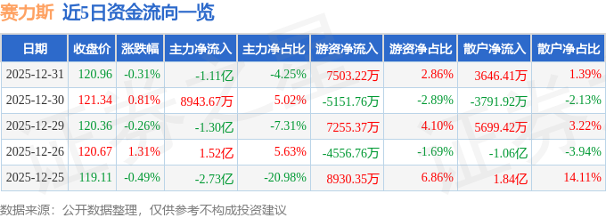 证券之星消息,截至2025年12月31日收盘,赛力斯(601127)报收于120.96元,下跌0.31%,换手率1.42%,成交量21.4万手,成交额26.26亿元。