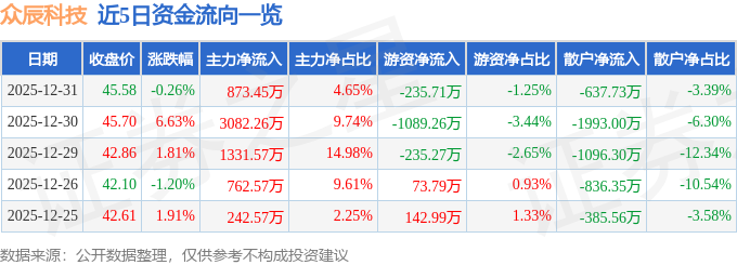 证券之星消息,截至2025年12月31日收盘,众辰科技(603275)报收于45.58元,下跌0.26%,换手率9.87%,成交量4.1万手,成交额1.88亿元。