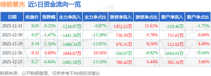 证券之星消息,截至2025年12月31日收盘,绿能慧充(600212)报收于8.05元,下跌0.25%,换手率2.92%,成交量15.51万手,成交额1.25亿元。