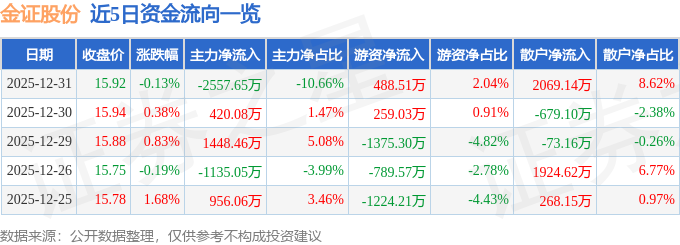 证券之星消息,截至2025年12月31日收盘,金证股份(600446)报收于15.92元,下跌0.13%,换手率1.6%,成交量15.03万手,成交额2.4亿元。