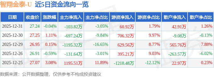 证券之星消息,截至2025年12月31日收盘,智翔金泰(688443)报收于27.24元,下跌0.04%,换手率1.07%,成交量1.25万手,成交额3399.02万元。