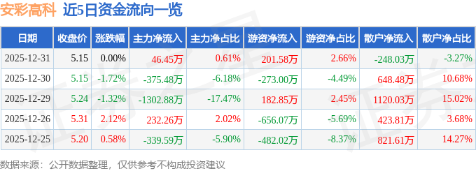 证券之星消息,截至2025年12月31日收盘,安彩高科(600207)报收于5.15元,上涨0.0%,换手率1.36%,成交量14.82万手,成交额7590.84万元。