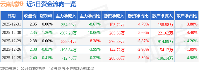 证券之星消息,截至2025年12月31日收盘,云南城投(600239)报收于2.35元,上涨0.0%,换手率1.09%,成交量17.44万手,成交额4087.64万元。