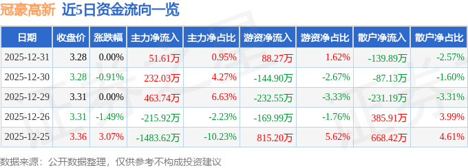 证券之星消息,截至2025年12月31日收盘,冠豪高新(600433)报收于3.28元,上涨0.0%,换手率0.95%,成交量16.61万手,成交额5433.72万元。