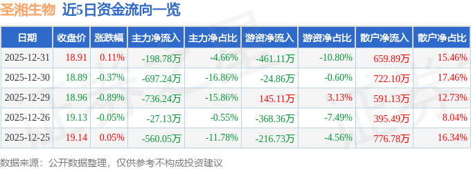 证券之星消息,截至2025年12月31日收盘,圣湘生物(688289)报收于18.91元,上涨0.11%,换手率0.39%,成交量2.26万手,成交额4267.75万元。