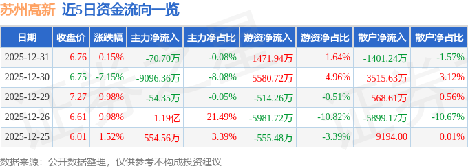 证券之星消息,截至2025年12月31日收盘,苏州高新(600736)报收于6.76元,上涨0.15%,换手率11.3%,成交量130.04万手,成交额8.95亿元。