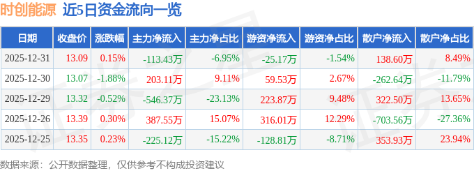 证券之星消息,截至2025年12月31日收盘,时创能源(688429)报收于13.09元,上涨0.15%,换手率1.04%,成交量1.25万手,成交额1633.17万元。