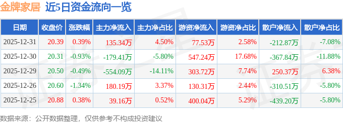 证券之星消息,截至2025年12月31日收盘,金牌家居(603180)报收于20.39元,上涨0.39%,换手率0.96%,成交量1.48万手,成交额3004.96万元。