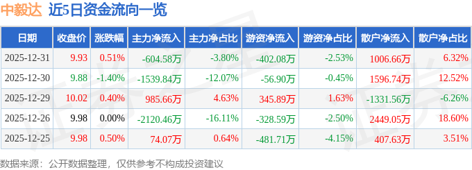 证券之星消息,截至2025年12月31日收盘,中毅达(600610)报收于9.93元,上涨0.51%,换手率2.28%,成交量16.14万手,成交额1.59亿元。