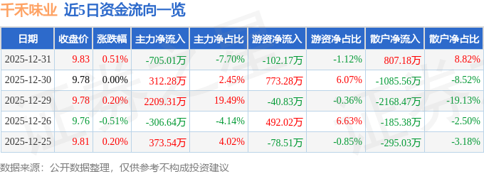 证券之星消息,截至2025年12月31日收盘,千禾味业(603027)报收于9.83元,上涨0.51%,换手率0.74%,成交量9.31万手,成交额9156.34万元。