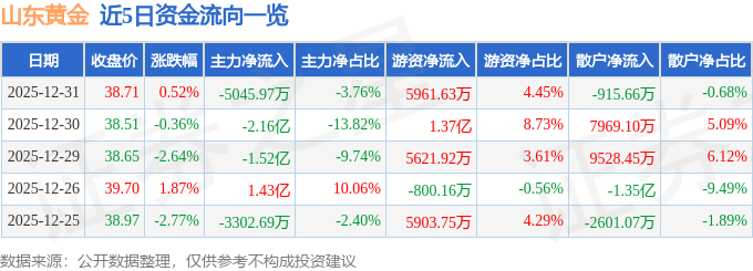 证券之星消息,截至2025年12月31日收盘,山东黄金(600547)报收于38.71元,上涨0.52%,换手率0.96%,成交量34.66万手,成交额13.41亿元。