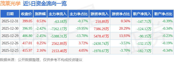 证券之星消息,截至2025年12月31日收盘,茂莱光学(688502)报收于399.05元,上涨0.53%,换手率5.56%,成交量9339.0手,成交额3.75亿元。