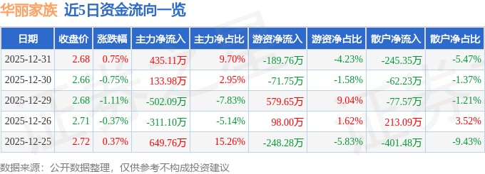 证券之星消息,截至2025年12月31日收盘,华丽家族(600503)报收于2.68元,上涨0.75%,换手率1.05%,成交量16.81万手,成交额4483.98万元。