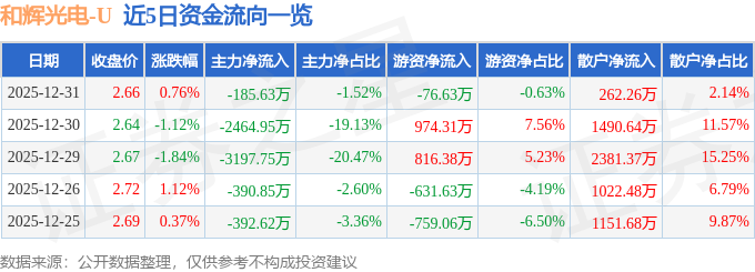 证券之星消息,截至2025年12月31日收盘,和辉光电(688538)报收于2.66元,上涨0.76%,换手率0.8%,成交量46.25万手,成交额1.22亿元。