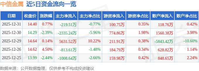 证券之星消息,截至2025年12月31日收盘,中信金属(601061)报收于14.4元,上涨0.77%,换手率3.95%,成交量19.82万手,成交额2.86亿元。