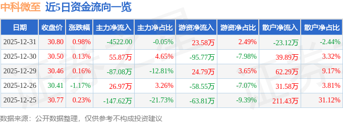 证券之星消息,截至2025年12月31日收盘,中科微至(688211)报收于30.8元,上涨0.98%,换手率0.24%,成交量3093.0手,成交额946.51万元。