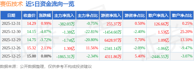 证券之星消息,截至2025年12月31日收盘,赛伍技术(603212)报收于14.29元,上涨0.99%,换手率8.11%,成交量35.49万手,成交额5.1亿元。