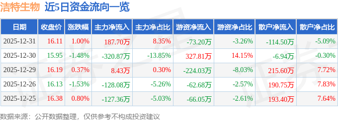 证券之星消息,截至2025年12月31日收盘,洁特生物(688026)报收于16.11元,上涨1.0%,换手率0.99%,成交量1.39万手,成交额2248.51万元。