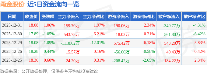 证券之星消息,截至2025年12月31日收盘,甬金股份(603995)报收于18.08元,上涨1.06%,换手率1.23%,成交量4.5万手,成交额8107.5万元。