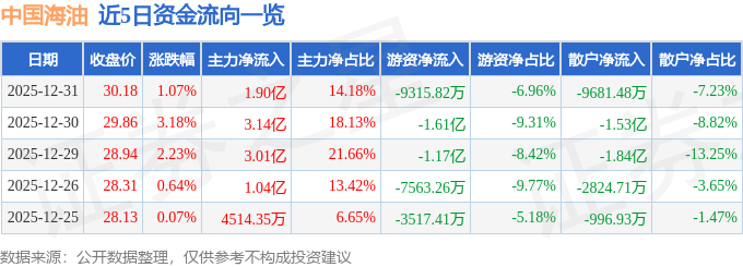 证券之星消息,截至2025年12月31日收盘,中国海油(600938)报收于30.18元,上涨1.07%,换手率1.49%,成交量44.4万手,成交额13.39亿元。