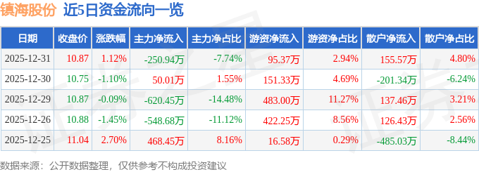 证券之星消息,截至2025年12月31日收盘,镇海股份(603637)报收于10.87元,上涨1.12%,换手率1.25%,成交量2.99万手,成交额3244.03万元。