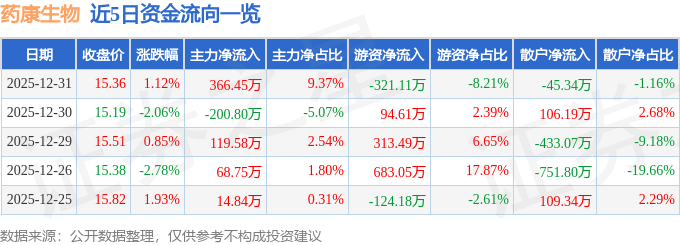 证券之星消息,截至2025年12月31日收盘,药康生物(688046)报收于15.36元,上涨1.12%,换手率0.62%,成交量2.55万手,成交额3912.5万元。