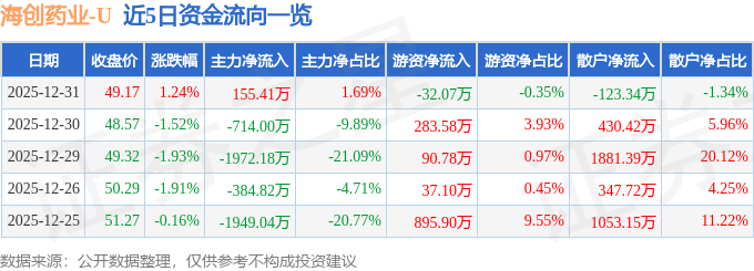 证券之星消息,截至2025年12月31日收盘,海创药业(688302)报收于49.17元,上涨1.24%,换手率1.89%,成交量1.87万手,成交额9170.58万元。