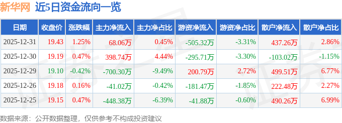 证券之星消息,截至2025年12月31日收盘,新华网(603888)报收于19.43元,上涨1.25%,换手率1.17%,成交量7.87万手,成交额1.53亿元。