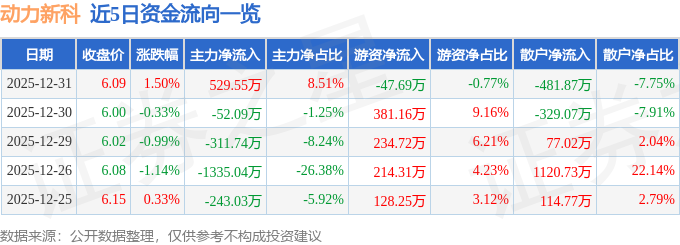 证券之星消息,截至2025年12月31日收盘,动力新科(600841)报收于6.09元,上涨1.5%,换手率0.99%,成交量10.34万手,成交额6219.32万元。