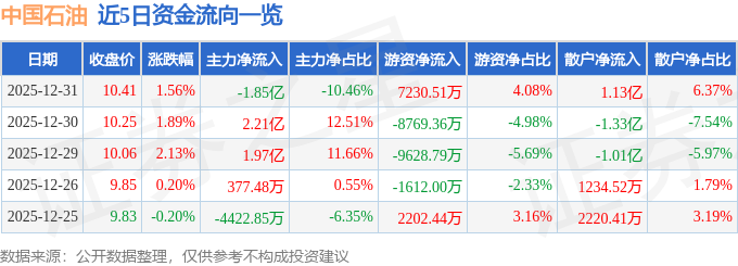 证券之星消息,截至2025年12月31日收盘,中国石油(601857)报收于10.41元,上涨1.56%,换手率0.11%,成交量170.56万手,成交额17.71亿元。