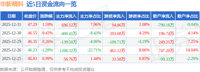 证券之星消息,截至2025年12月31日收盘,华新精科(603370)报收于47.29元,上涨1.59%,换手率5.44%,成交量1.86万手,成交额8741.79万元。