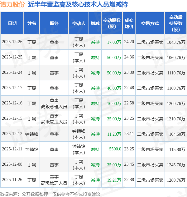 证券之星消息,根据12月31日市场公开信息、上市公司公告及交易所披露数据整理,诺力股份(603611)最新董监高及相关人员股份变动情况:2025年12月26日公司董事丁晟共减持公司股份17.0万股,占公司总股本为0.066%。变动期间公司股价下跌1.31%,12月26日当日收盘报24.1元。