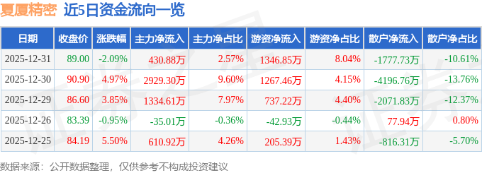 证券之星消息,截至2025年12月31日收盘,夏厦精密(001306)报收于89.0元,下跌2.09%,换手率12.18%,成交量1.89万手,成交额1.68亿元。