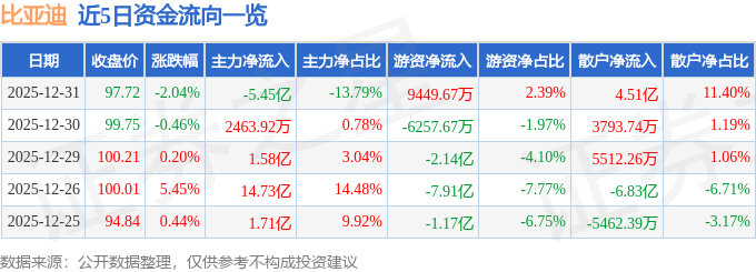 证券之星消息,截至2025年12月31日收盘,比亚迪(002594)报收于97.72元,下跌2.04%,换手率1.16%,成交量40.29万手,成交额39.55亿元。
