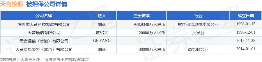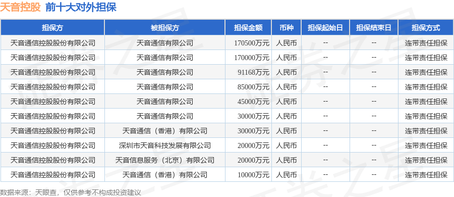 天音控股12月30日披露14笔对外担保,被担保公司6家。担保金额排在前十的对外担保明细如下表: