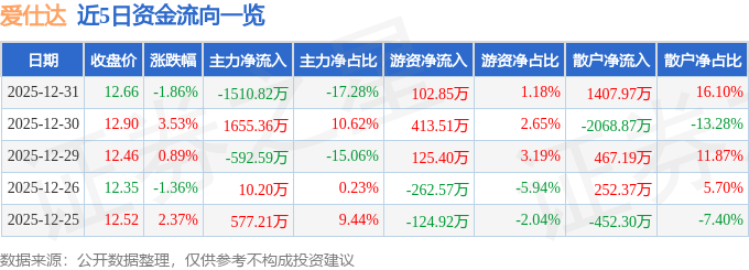 证券之星消息,截至2025年12月31日收盘,爱仕达(002403)报收于12.66元,下跌1.86%,换手率2.31%,成交量6.88万手,成交额8742.46万元。