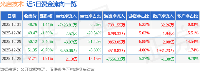证券之星消息,截至2025年12月31日收盘,光启技术(002625)报收于48.76元,下跌1.44%,换手率1.12%,成交量24.16万手,成交额11.87亿元。