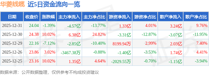 证券之星消息,截至2025年12月31日收盘,华菱线缆(001208)报收于24.04元,下跌1.39%,换手率53.04%,成交量139.72万手,成交额33.19亿元。