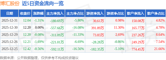 证券之星消息,截至2025年12月31日收盘,博汇股份(300839)报收于12.04元,下跌1.31%,换手率0.89%,成交量2.58万手,成交额3114.26万元。