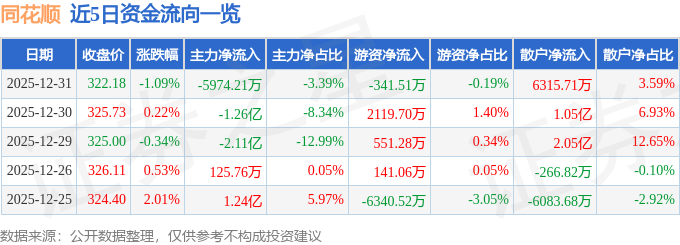 证券之星消息,截至2025年12月31日收盘,同花顺(300033)报收于322.18元,下跌1.09%,换手率1.97%,成交量5.42万手,成交额17.62亿元。