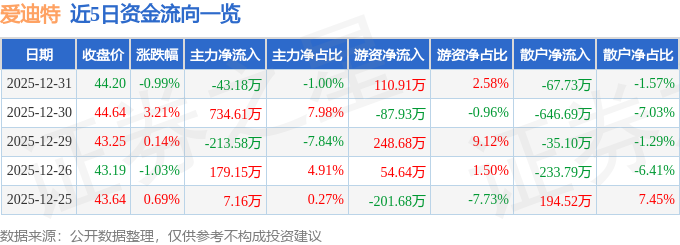 证券之星消息,截至2025年12月31日收盘,爱迪特(301580)报收于44.2元,下跌0.99%,换手率1.35%,成交量9733.0手,成交额4303.72万元。