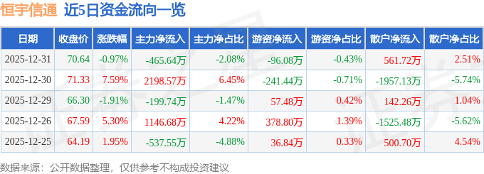 证券之星消息,截至2025年12月31日收盘,恒宇信通(300965)报收于70.64元,下跌0.97%,换手率5.71%,成交量3.18万手,成交额2.24亿元。