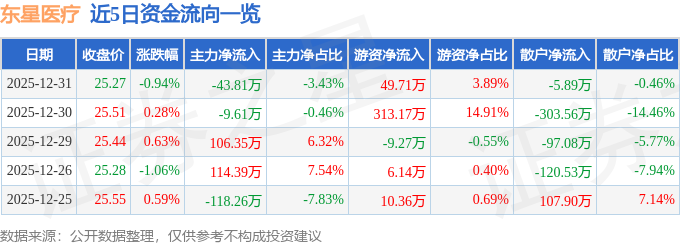 证券之星消息,截至2025年12月31日收盘,东星医疗(301290)报收于25.27元,下跌0.94%,换手率0.74%,成交量5063.0手,成交额1279.23万元。