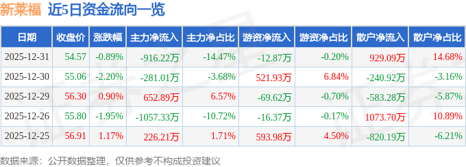 证券之星消息,截至2025年12月31日收盘,新莱福(301323)报收于54.57元,下跌0.89%,换手率1.71%,成交量1.16万手,成交额6330.72万元。