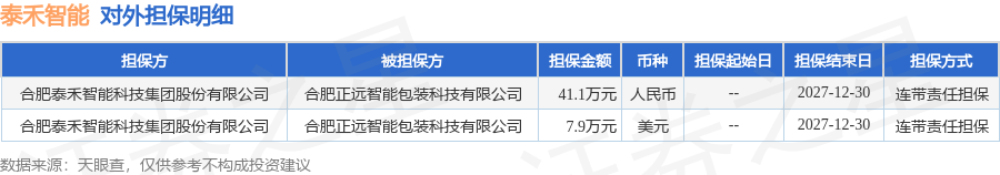 泰禾智能12月30日披露2笔对外担保,被担保方为合肥正远智能包装科技有限公司。对外担保明细如下表: